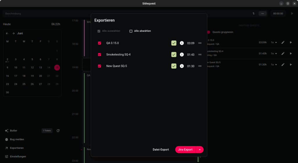 Mit nur einem Klick auf EXPORTIEREN werden alle erfassten Zeiten direkt dem passenden Jira-Ticket und dem richtigen Kunden zugeordnet – schnell, exakt und zuverlässig.